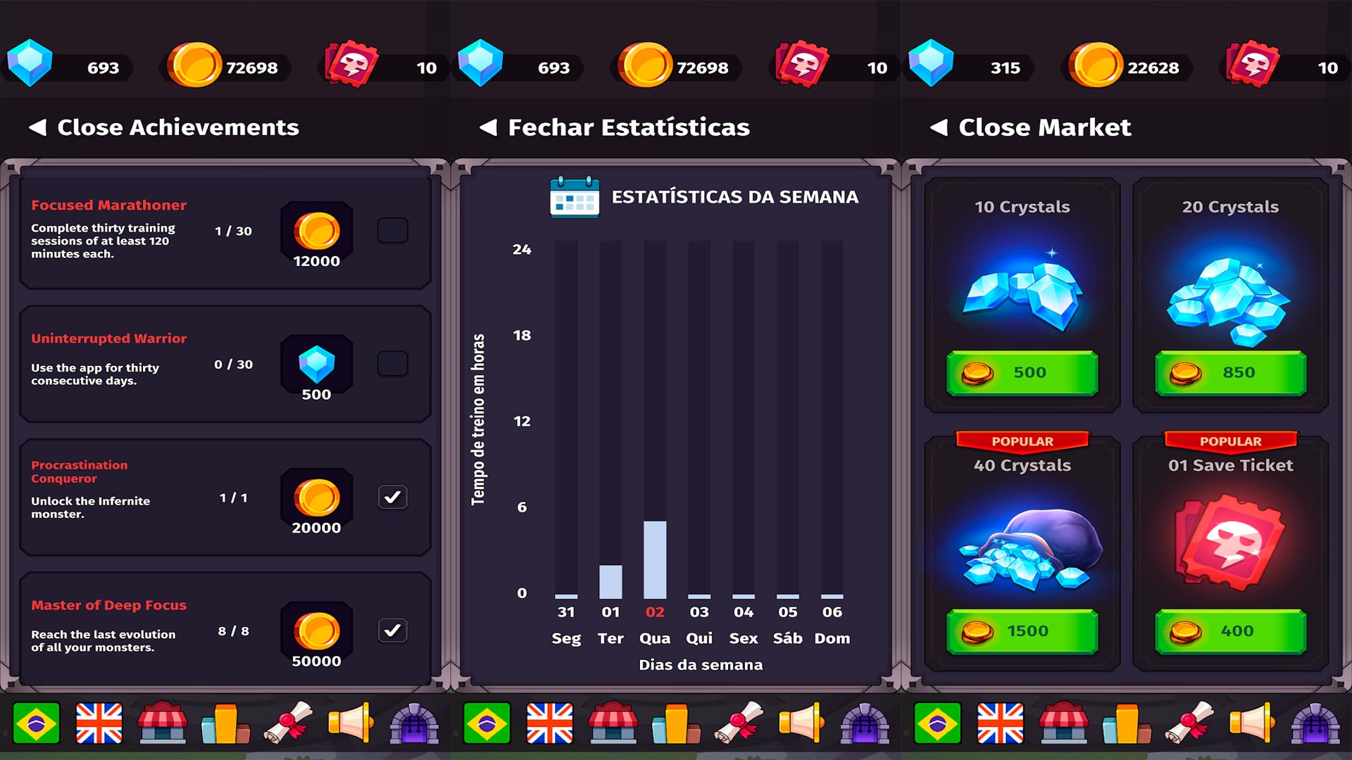 This is a game to help you focus on your daily tasks and maintain a routine that's more free from the distractions of your phone. In this game you choose how long to train a monster and must leave your phone aside during the chosen time. Using your phone for anything during the training time will result in your monster losing experience points, and you will lose coins and crystals (which are items used to unlock new monsters).