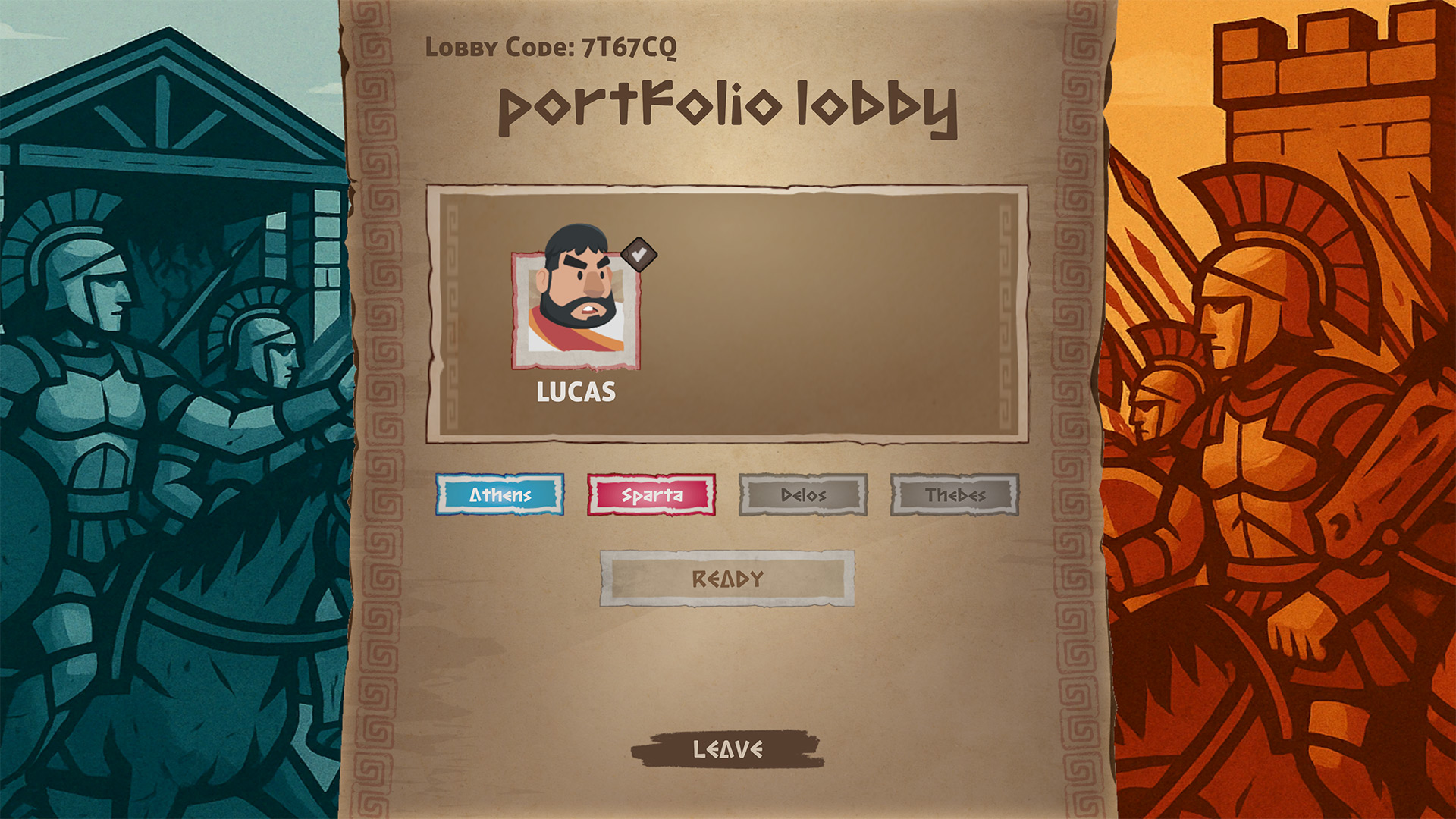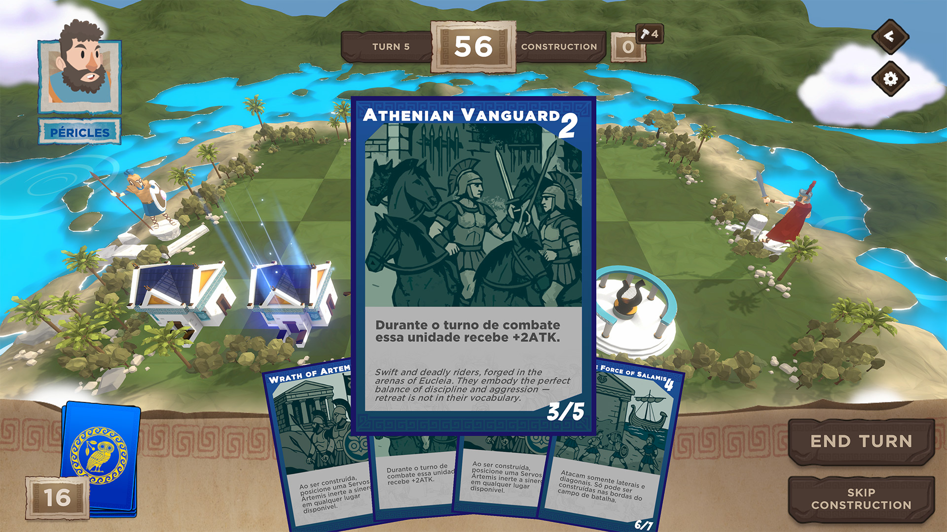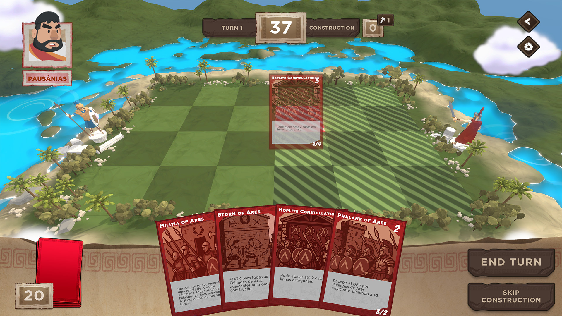 A turn-based card and board game that can be played offline in single-player or online multiplayer. Players must choose between Ancient Greek city-states (Athens and Sparta in the prototype version) with unique strategic characteristics. The 4-row, 6-column board houses each card's buildings, and the objective is to complete a row with units from their city-state. Units have attack and defense values that the player can use to determine combat and pave the way to victory. Each unit has its own unique characteristics: restricted building positions, attack range, abilities that can increase the defense and attack of neighboring units, and the ability to move, among others.