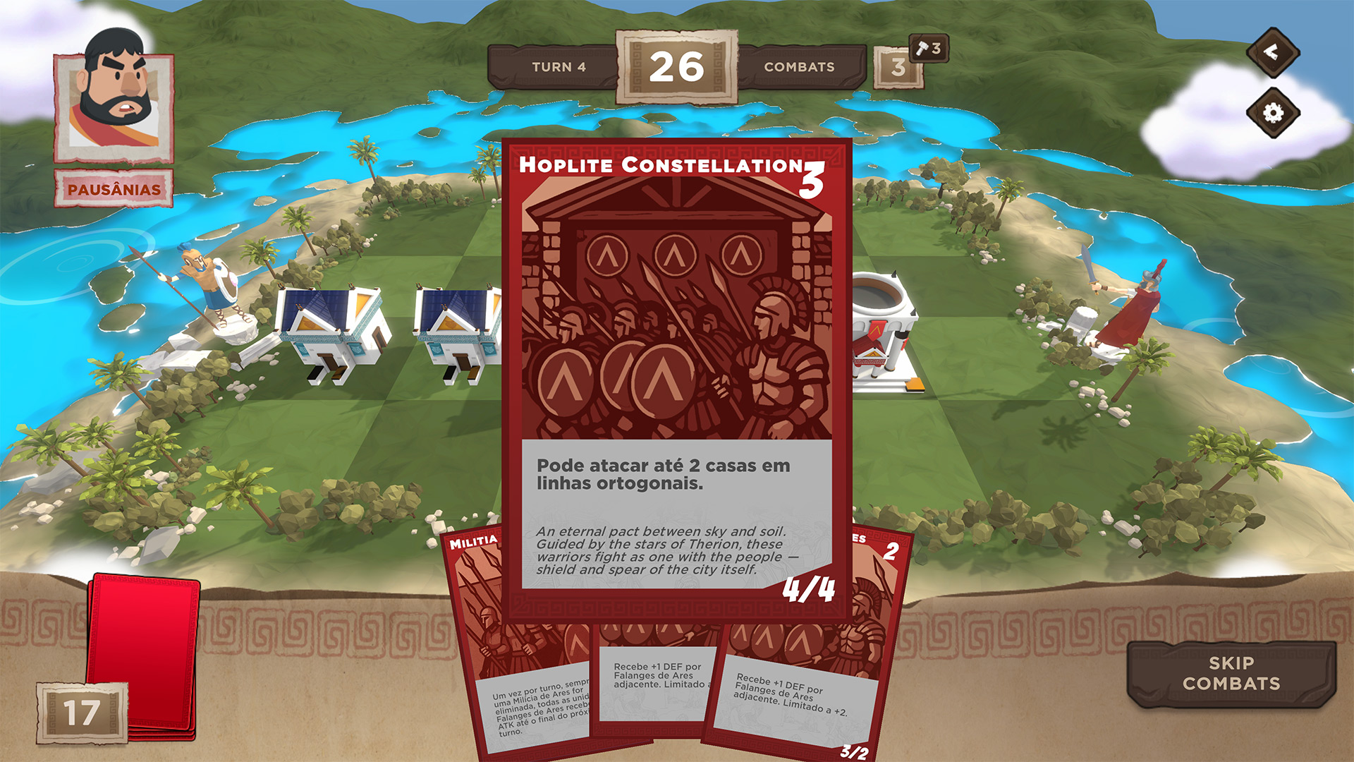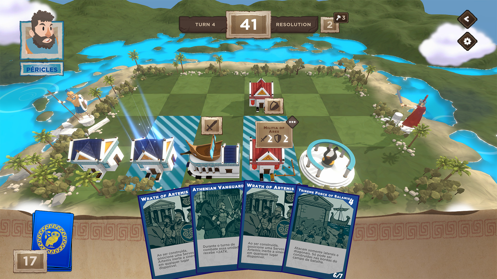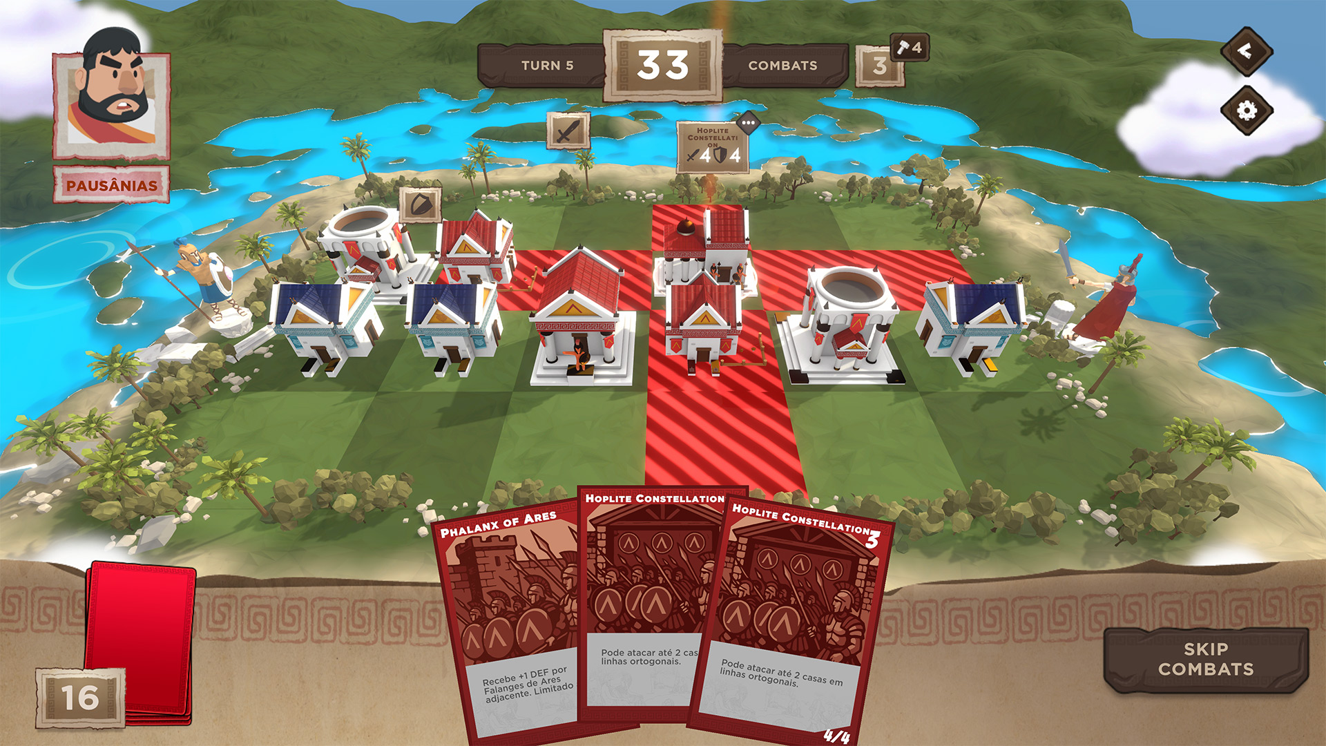 A turn-based card and board game that can be played offline in single-player or online multiplayer. Players must choose between Ancient Greek city-states (Athens and Sparta in the prototype version) with unique strategic characteristics. The 4-row, 6-column board houses each card's buildings, and the objective is to complete a row with units from their city-state. Units have attack and defense values that the player can use to determine combat and pave the way to victory. Each unit has its own unique characteristics: restricted building positions, attack range, abilities that can increase the defense and attack of neighboring units, and the ability to move, among others.